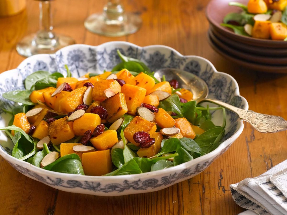 • Serve squash warm or cool over arugula or spinach; drizzle with remaining dressing and top with almonds and dried cranberries. Top with feta or goat cheese if desired. Or toss all the ingredients together with the dressing in a salad bowl. Serve immediately.