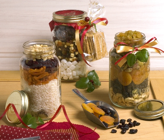 Homemade food gifts add a personal touch to holiday gift-giving. And they’re easy! I like that they’re consumable so there’s nothing to store after it’s eaten, and can be something new and fun for the recipient. Plus, it can usually be shared so it expands the gift! Glass jars are a clever way to package a variety of ‘recipes’. Cookies work well, layering the dry ingredients in the jar to be mixed later with fresh butter and eggs. For Sun-Maid, I created three dried fruit gift jars: Fruity S’mores Bars, a play on the campfire treat but made into a cookie bar; Fruited Rice Pilaf, quick-cooking rice with herbs, pinenuts, dried apricots and cranberries; and a simple jar of good quality dried fruit and nuts layered attractively for a snack mix. My recipes are designed for 32-ounce mason jars (wide mouth style are easiest to fill.) Or use any shape jar or crock, even a 26-ounce pasta sauce jar can work if ingredients are packed tight. There are also lots of recipe ideas on the web for gift jars. Have fun with it!