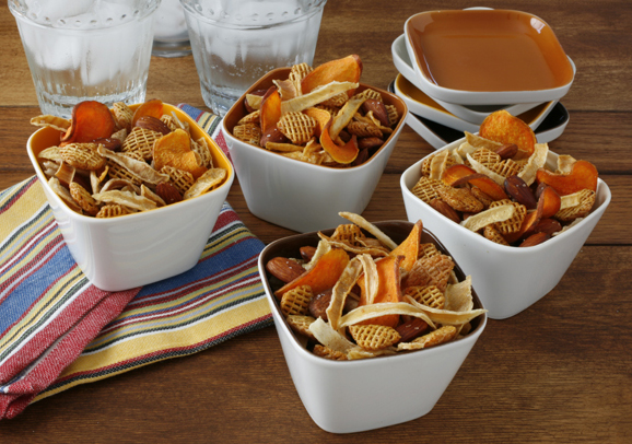 - Remove from oven and immediately add onion crisps and sweet potato chips. Mix well. Cool. Store in airtight container up to one week.