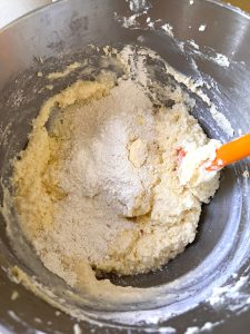 - Gently scoop one-fourth of the flour mixture and sprinkle over the creamed mixture. Stir the flour in with a rubber spatula. Then pour in one-third of the buttermilk-vanilla mixture and stir to blend together. Repeat this procedure, ending with the flour mixture. With each addition scrape the sides of the bowl, and continue to mix until smooth. Stirring in the flour last rather than the liquid binds the batter together to form the desirable consistency.