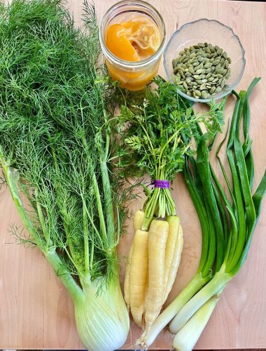 I didn’t measure for this Zhug, just used most of the fuzzy fennel fronds and a few fennel stems, all the carrot tops, two pieces of the dark green from one spring onion (very flavorful so adjust to taste), then whizzed it up with two salty-briny preserved lemon* pieces, and about 1/4 cup each olive oil and plain yogurt. Added a generous handful of raw pumpkin seeds and blended again. First taste was yum so it was done! (Remember, my amounts are estimates but this ‘recipe’ is forgiving).